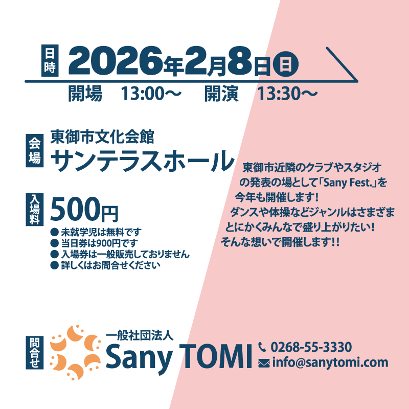 東御市近隣のクラブやスタジオの発表の場として「Sany Fest.」を今年も開催します!